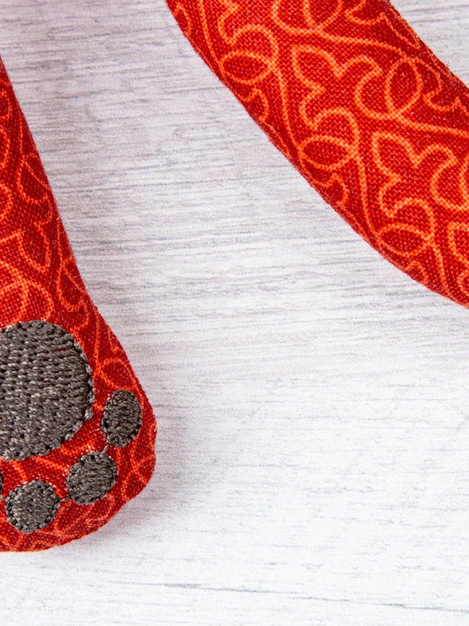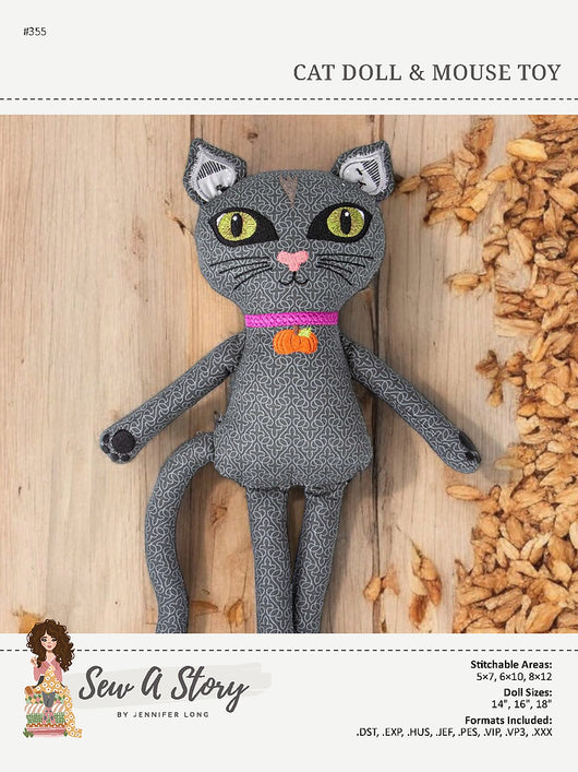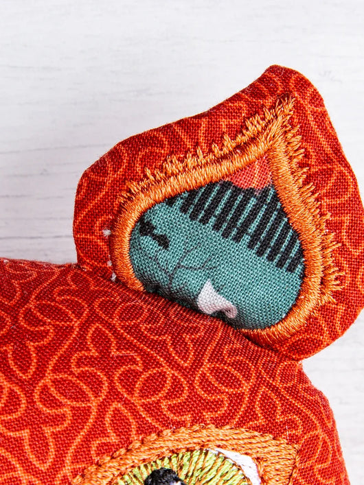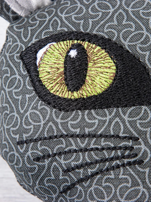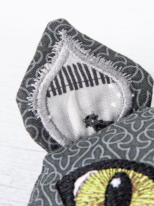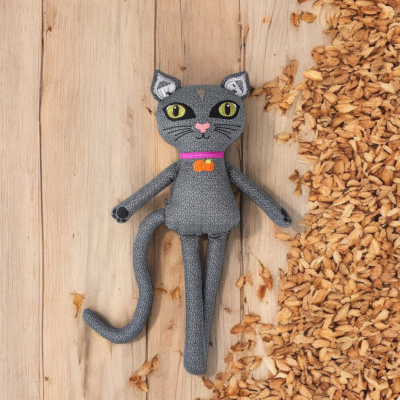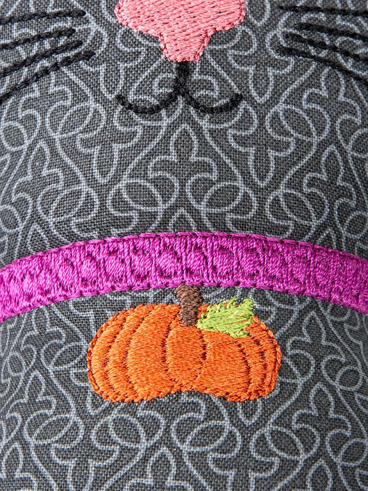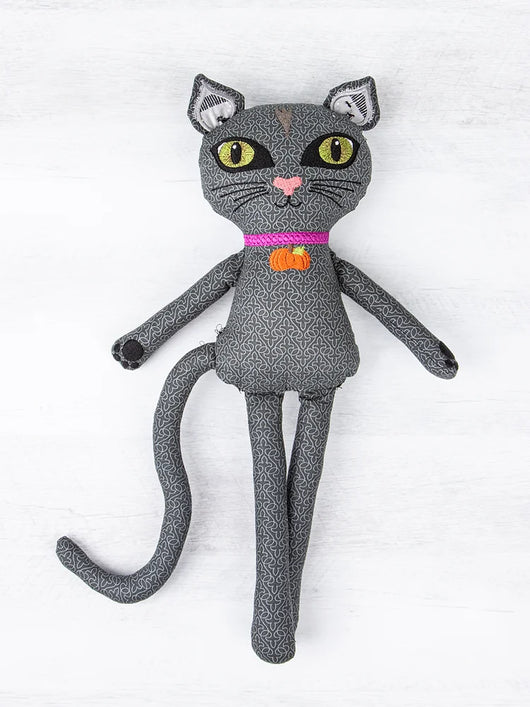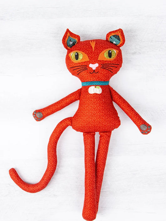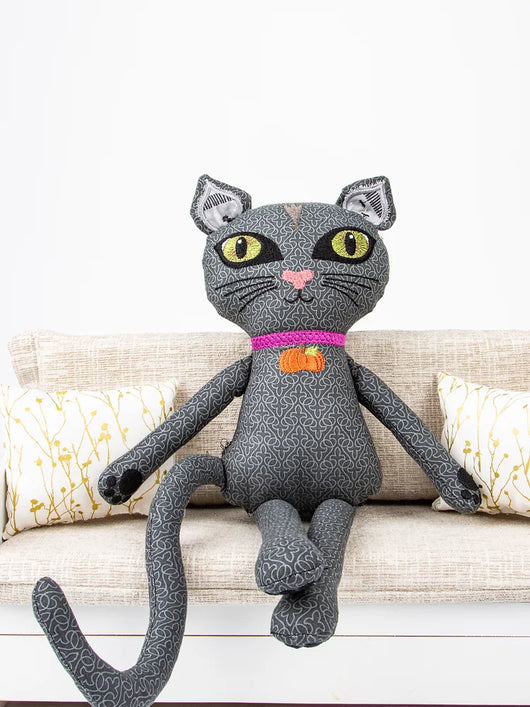This adorable cat is the purr-fect machine-embroidery project! Featuring striking stitched eyes and a fun collar with pumpkin charm, this cat doll and bonus mouse toy are made completely in-the-hoop.