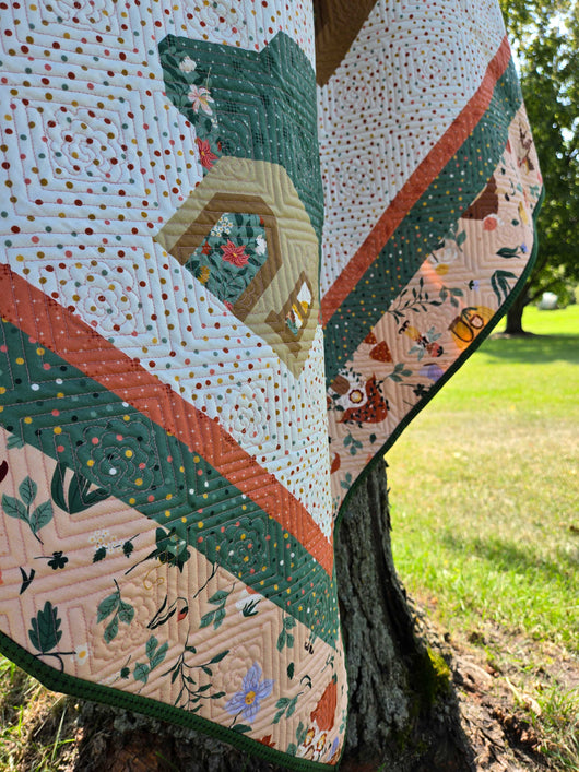 The Fairy Village Quilt is shown using the Thimbelina and the Sewing Fairies fabric collection by Jennifer Long of Sew A Story for Riley Blake Designs. It pairs beautifully with the Thimbelina Quilt, Spoolful of Charm Quilt, and other coordinating projects from the same collection.