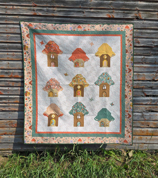 Create a whimsical neighborhood of sewing fairy houses with the Fairy Village Quilt. Designed for parents, grandparents, and handmade gift-makers, this traditionally pieced quilt features a collection of charming house blocks, each with detailed doors, windows, roofs, and starry accents. A joyful project full of color and character. Finished size: 62½" × 71½".