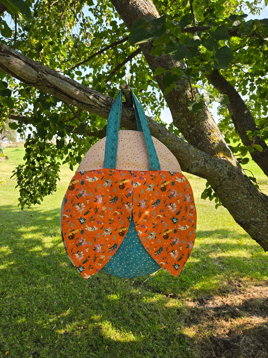 The Flutterbug Bag is a playful and functional sewing project inspired by the Thimbelina sewing fairies. Designed for parents, grandparents, and handmade gift-makers, this ladybug-shaped bag features curved wings, fabric straps, a secure zipper closure, and interior dividers to keep treasures organized. Finished size: 14" tall × 13" wide (excluding handles).