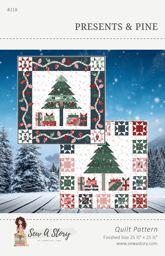 Create the festive Presents and Pine Quilt with this pattern. Designed for parents, grandparents, and handmade gift-makers, this quilt captures the spirit of giving and the beauty of the season in a timeless design. Finished size: 64" x 76".