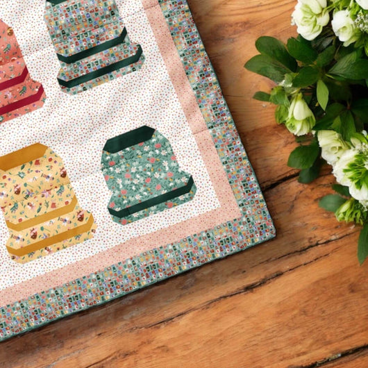 This quilt is shown using the Thimbelina and the Sewing Fairies fabric collection by Jennifer Long of Sew A Story for Riley Blake Designs. It pairs beautifully with the Garden Spools, Fairy Village, and Spoolful of Charm quilts for a full Thimbelina-inspired series.