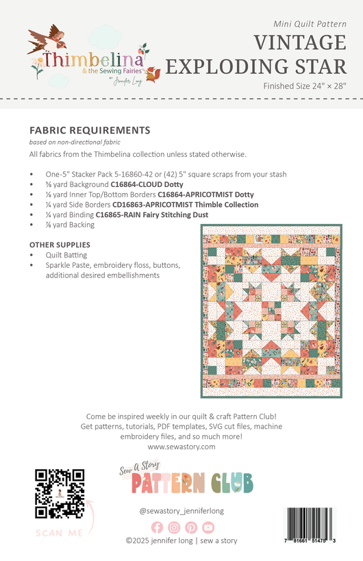 This quilt features the Thimbelina fabric collection by Jennifer Long – Sew A Story, arriving in shops October 2025. Pair it with coordinating patterns like Fairy Village or Thimble Collection, also coming this fall, for a beautifully storybook-inspired set.